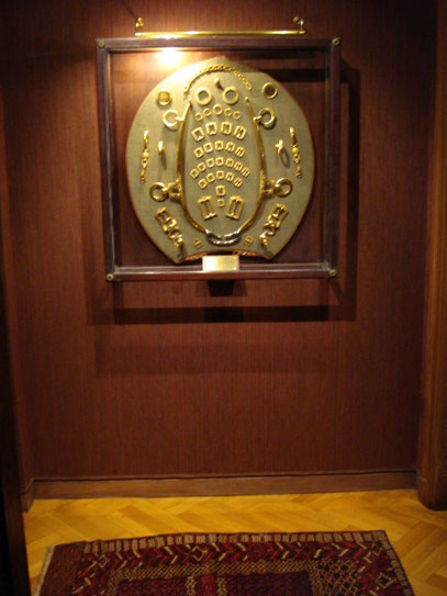 El palier principal tenía ya esa caja de vidrio conteniendo la panoplia con importantes herrajes de arneses de hierro bronceado y bañados en oro 27 K, hechos en el siglo XIX por la famosa Maison S. Poursin de Paris, fundada en 1830. Se los restauró y puso en valor. Se le cambió la calidad y color del género a la panoplia. Las paredes se entelaron, terminadas con doble vivo. Las puertas originales eran de roble americano. A la puerta del ascensor, que era metálica y muy fea, se la disimuló e integró a las del departamento enchapándola con roble americano. El parquet es de roble de Eslavonia y la alfombra una Boukara.