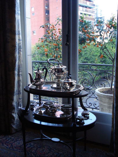 Afuera, planteros de diseño ultraclásico con plantas de quinotos. Sus follajes aislan de las miradas de vecinos indiscretos, evitando las deprimentes cortinas de voile, y los tonos anarajandos de sus frutos se llevan de maravillas con los azules de la Toile de Jouy, por serles complementarios. La plata con punzones que denotan el origen alemán de los orfebres que hicieron el magnífico juego de té, refleja los tonos de las últimas horas de la tarde de Buenos Aires, muy cerca del lugar donde San Martín estableció el Cuartel del Retiro, donde adiestraría a sus bravos Granaderos a Caballo, para darles la libertad a la Argentina, Chile y Perú.