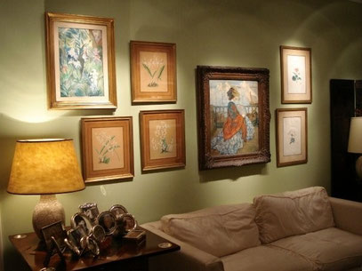 Una acuarela de Jorge Larco, tres grabados de descripción científica de distintas variedades de narcisos con passe-partouts franceses hechos a mano, un óleo de Camy con su marco Luis XIV y dos motivos florales japoneses también pintados a mano. El detalle importante: la mezcla en el ambiente de la moderna iluminación halógena para poner en valor las obras de arte con la tradicional iluminación incandescente proveniente de las clásicas lámparas con pantallas de pergamino. Es precisamente esa mezcla lo que hará que el efecto general no quede frío.